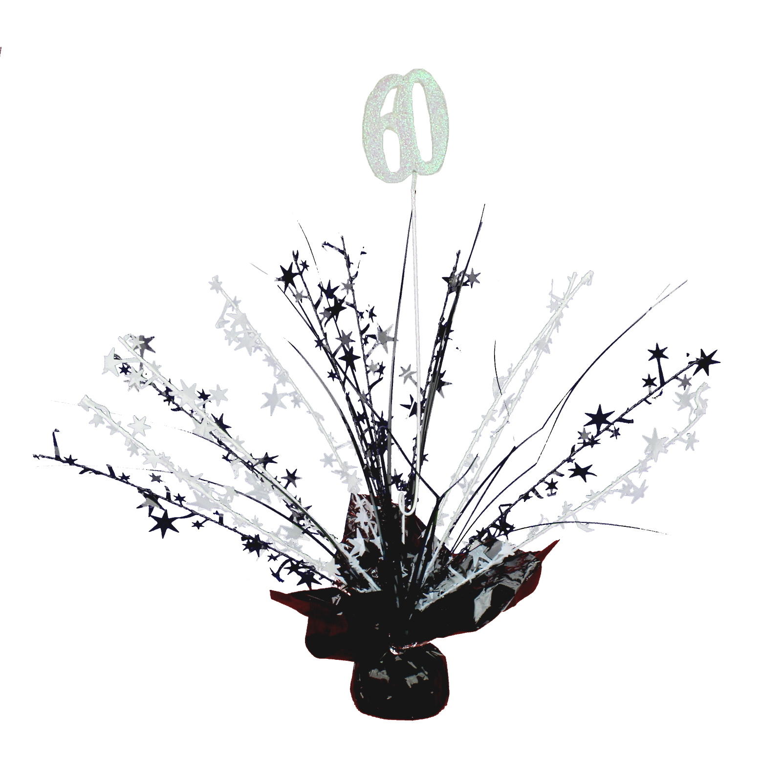 Centrepiece features a black cellophane base, black and white star sprays and a glittery 60th decoration in the centre.