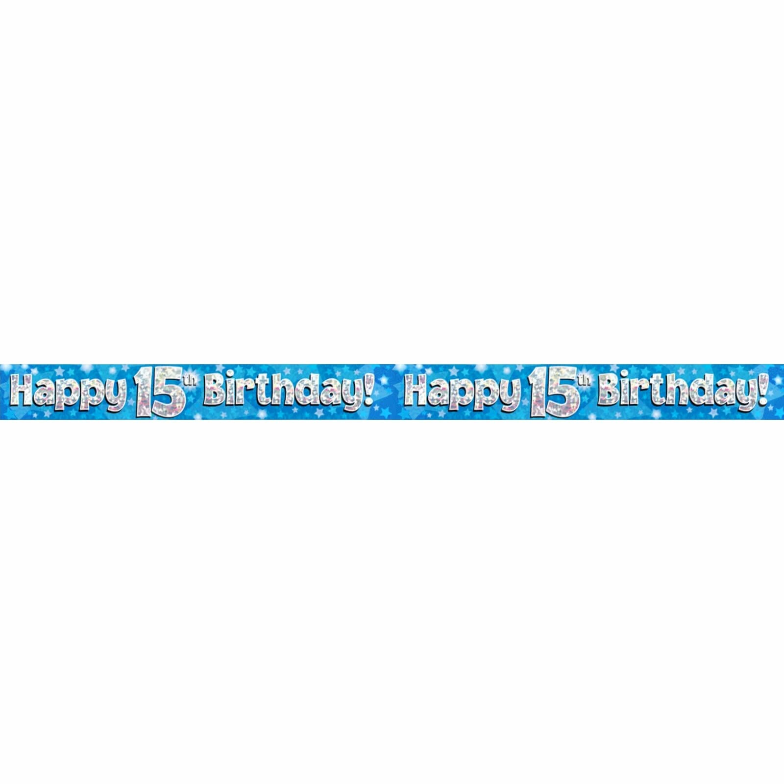 Happy 15th Birthday Blue Holographic Banner. Shining blue holographic banner for a 15th birthday party.