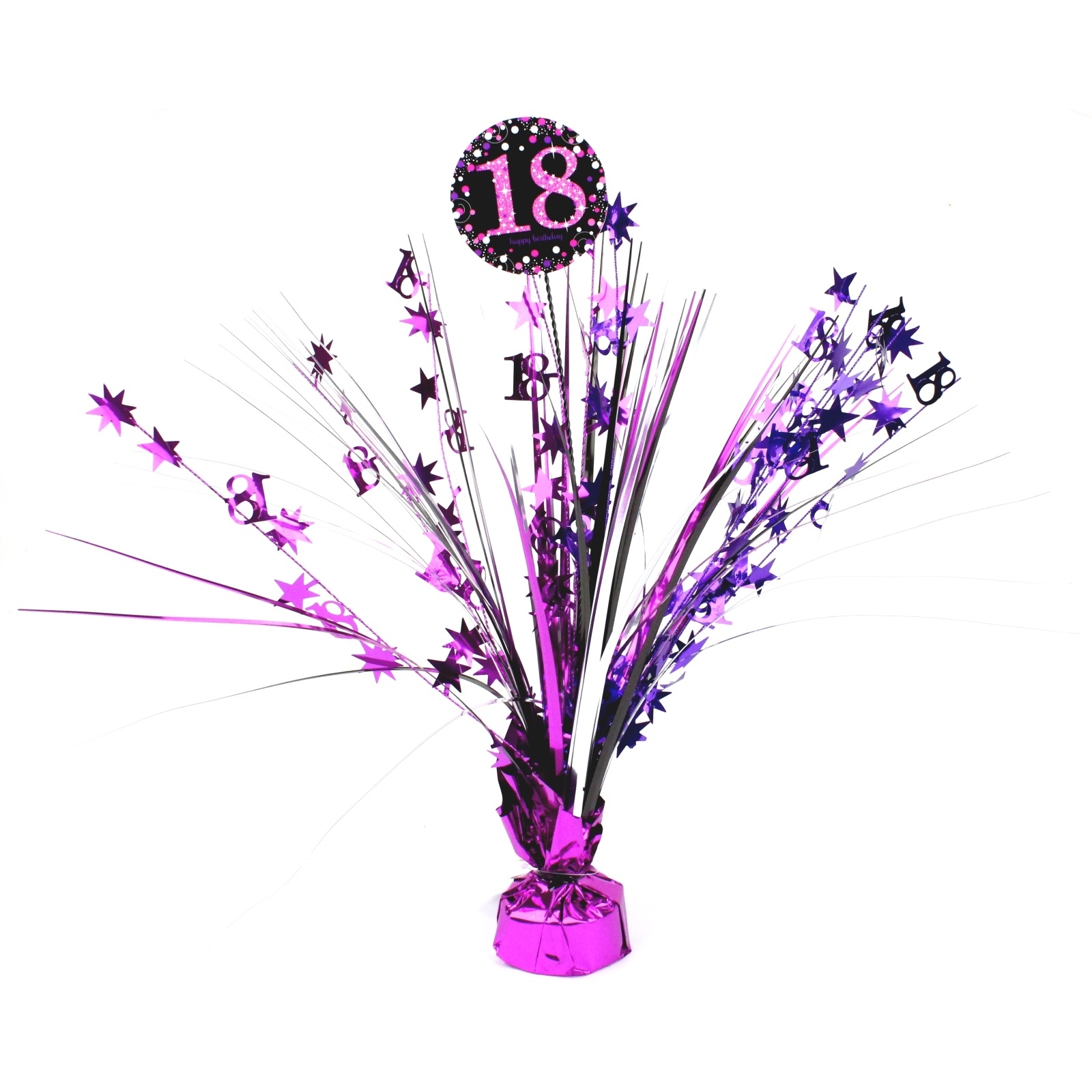 Featuring black, silver, pink and purple foil strands with "18" silhouettes and star shapes on the ends and a "18th" cardboard header at the top, this fabulous centrepiece makes a fun way to finish off your 18th birthday party table and will give your party table or party food trays a dazzling effect.